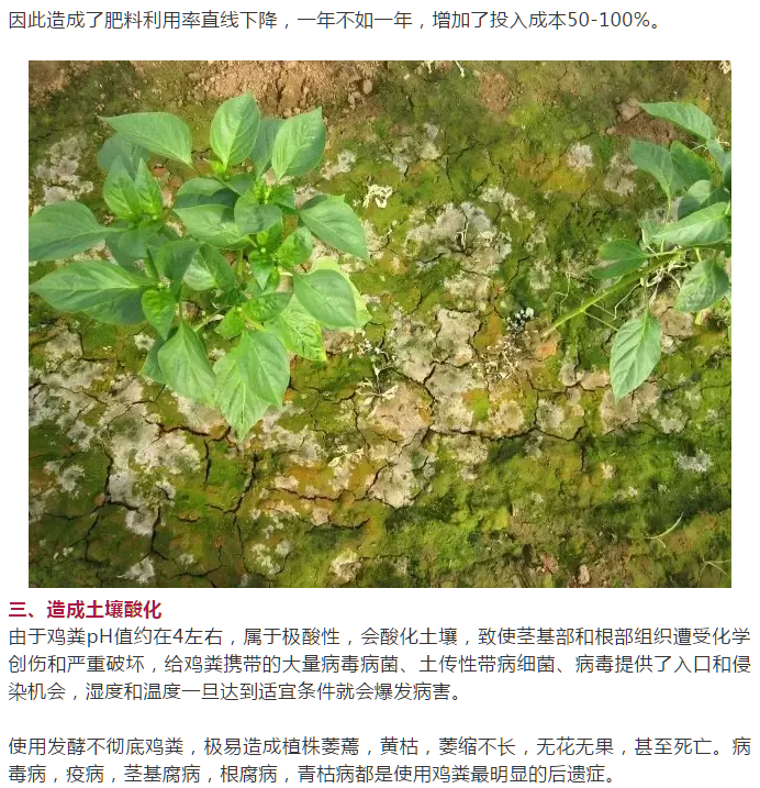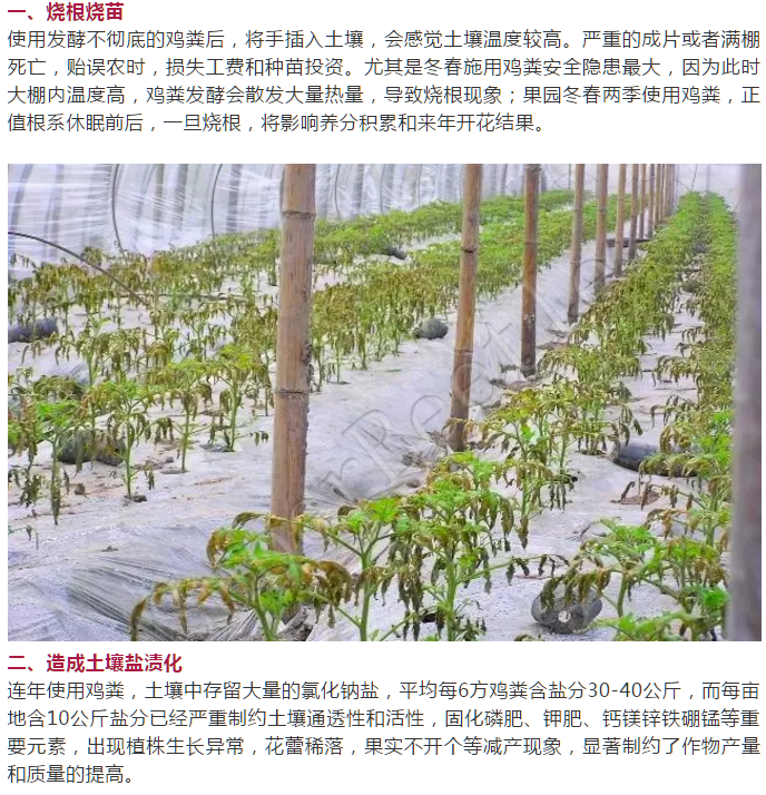 以鸡粪为例: 无论干湿鸡粪,未经发酵长期使用很容易造成大棚蔬菜、果园等经济作物的破坏,给种植户造成巨大的经济损失。